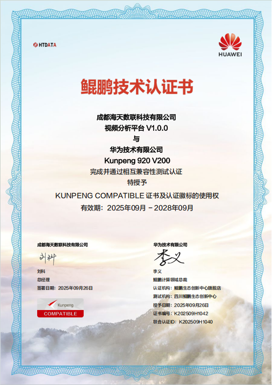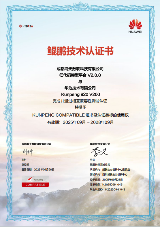 近日,君逸数码控股子公司海天数联自主研发的全系列AI产品线——AI智能体平台、AI视频分析平台、低代码机器学习平台、知识图谱平台,顺利完成华为Kunpeng 920兼容性测试,荣获华为KUNPENG COMPATIBLE认证证书!这标志着海天数联在国产化AI基础软件领域的技术实力再获权威认可。