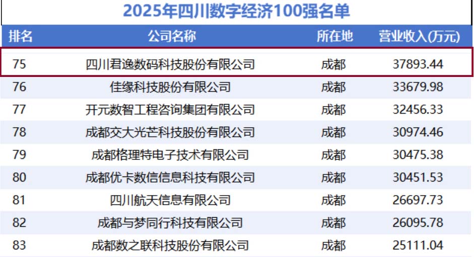 君逸数码荣登2025年四川数字经济企业100强榜单