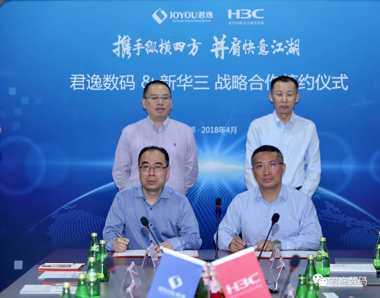 2018年4月19日,四川君逸数码科技股份有限公司(以下简称“君逸数码”)与紫光旗下新华三集团(以下简称“新华三集团”)战略合作签约仪式在君逸数码总部隆重举行。新华三集团副总裁、产品行销部总经理毕首文,新华三集团成都研究院院长、四川代表处总经理管志强,新华三集团网络产品部副总经理杨海军与君逸数码董事长曾立军、副总经理杜晓峰、副总经理谢明、副总经理张志锐等出席了签约仪式。